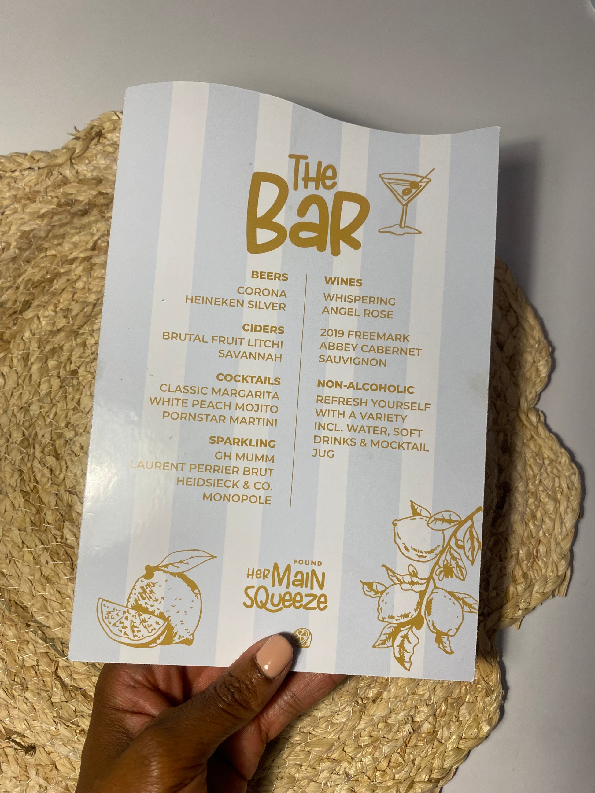 Bring a personal touch to your event with our trendy “found her main squueze” standing Bar signage